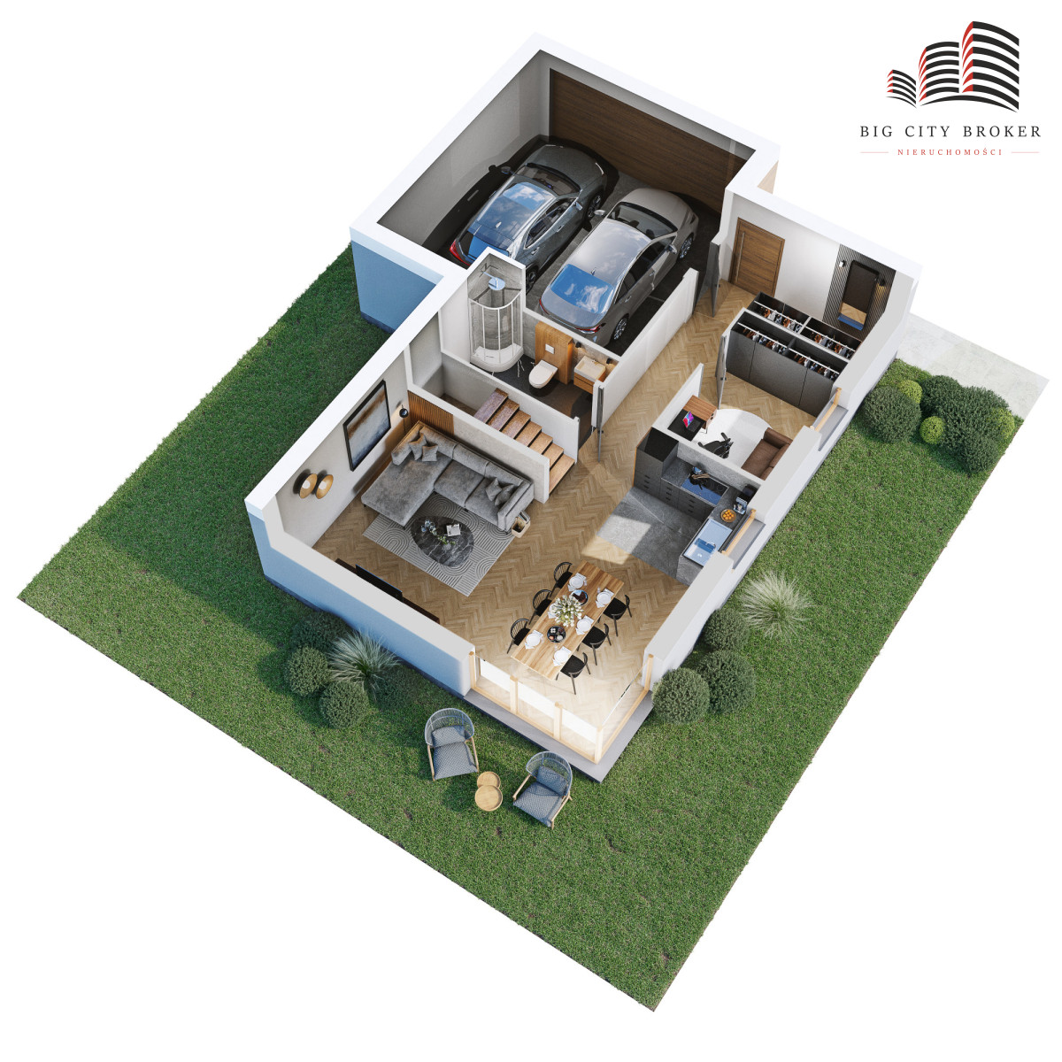 dwustanowiskowy garaż z bramą z napędemPiętro:- 3 przestronne pokoje