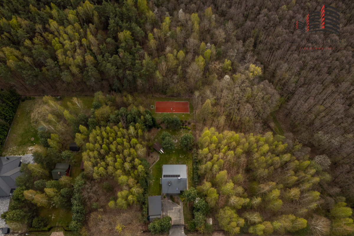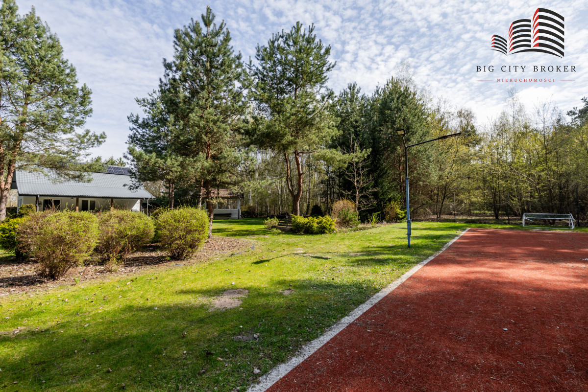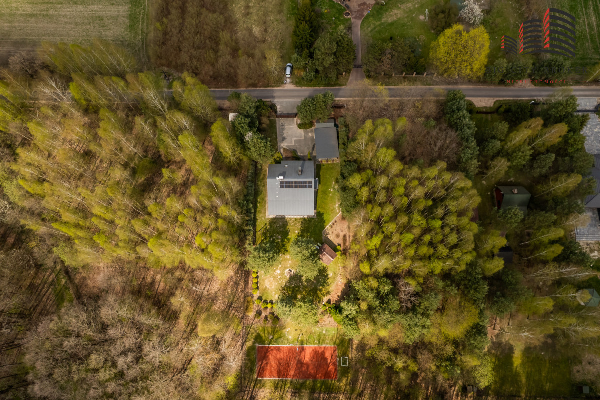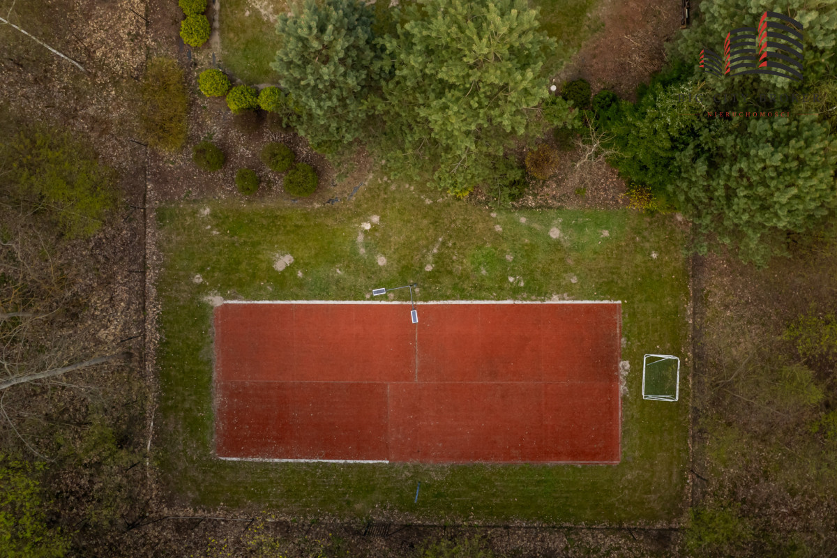 Działka o powierzchni 2003 m² została starannie zagospodarowana — liczne nasadzenia tworzą prywatny, zielony azyl. Na terenie posesji znajduje się również prywatny kort tenisowy, co czyni tę ofertę wyjątkową i atrakcyjną dla osób aktywnych.