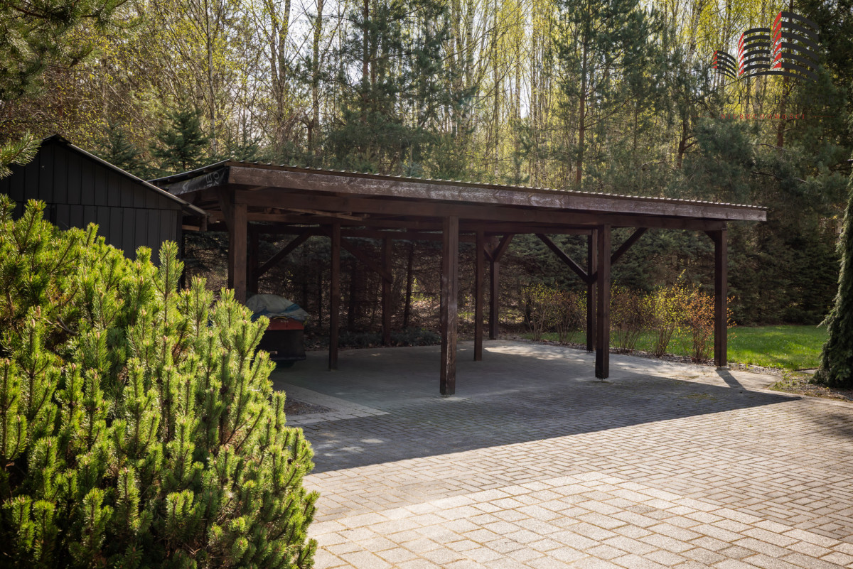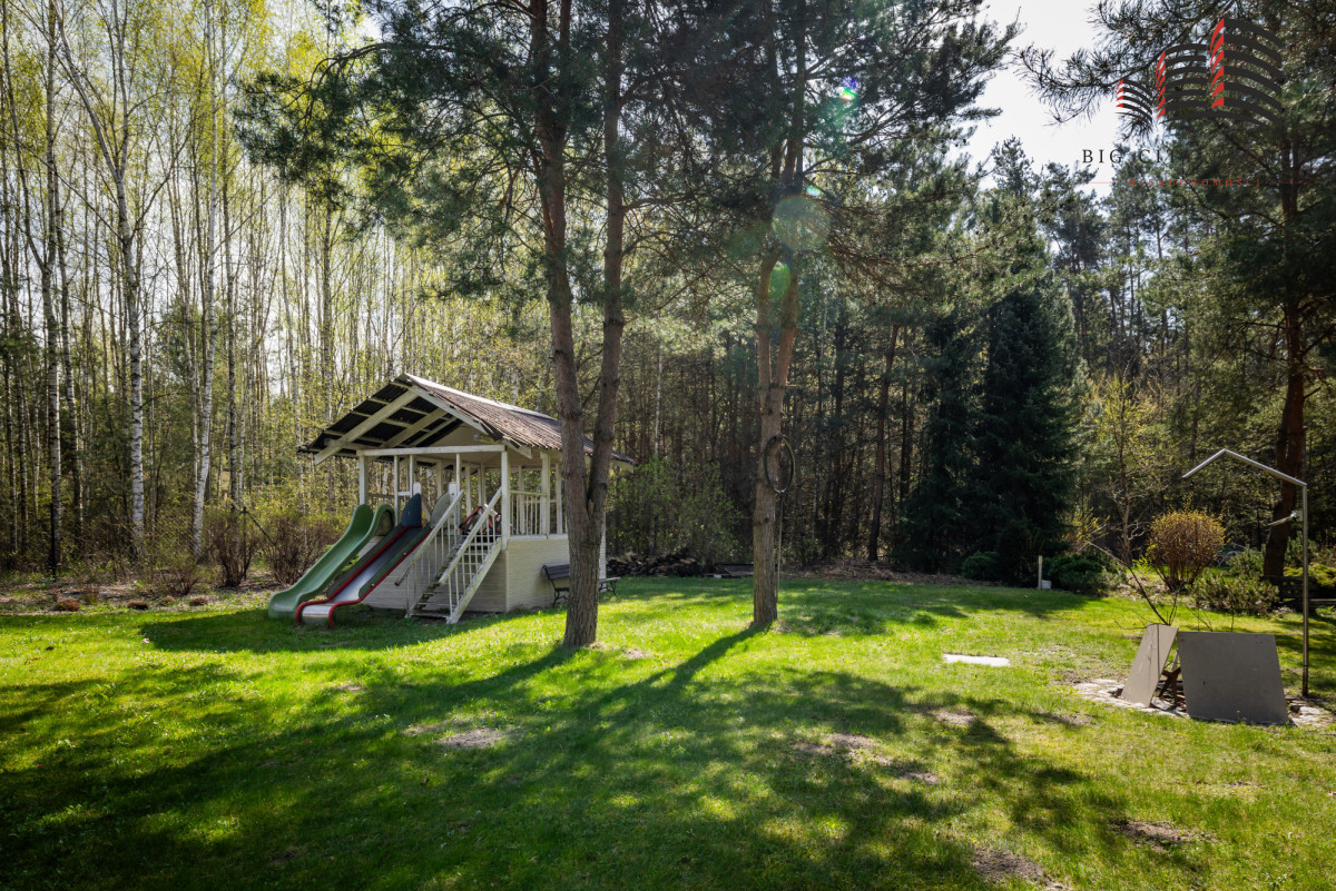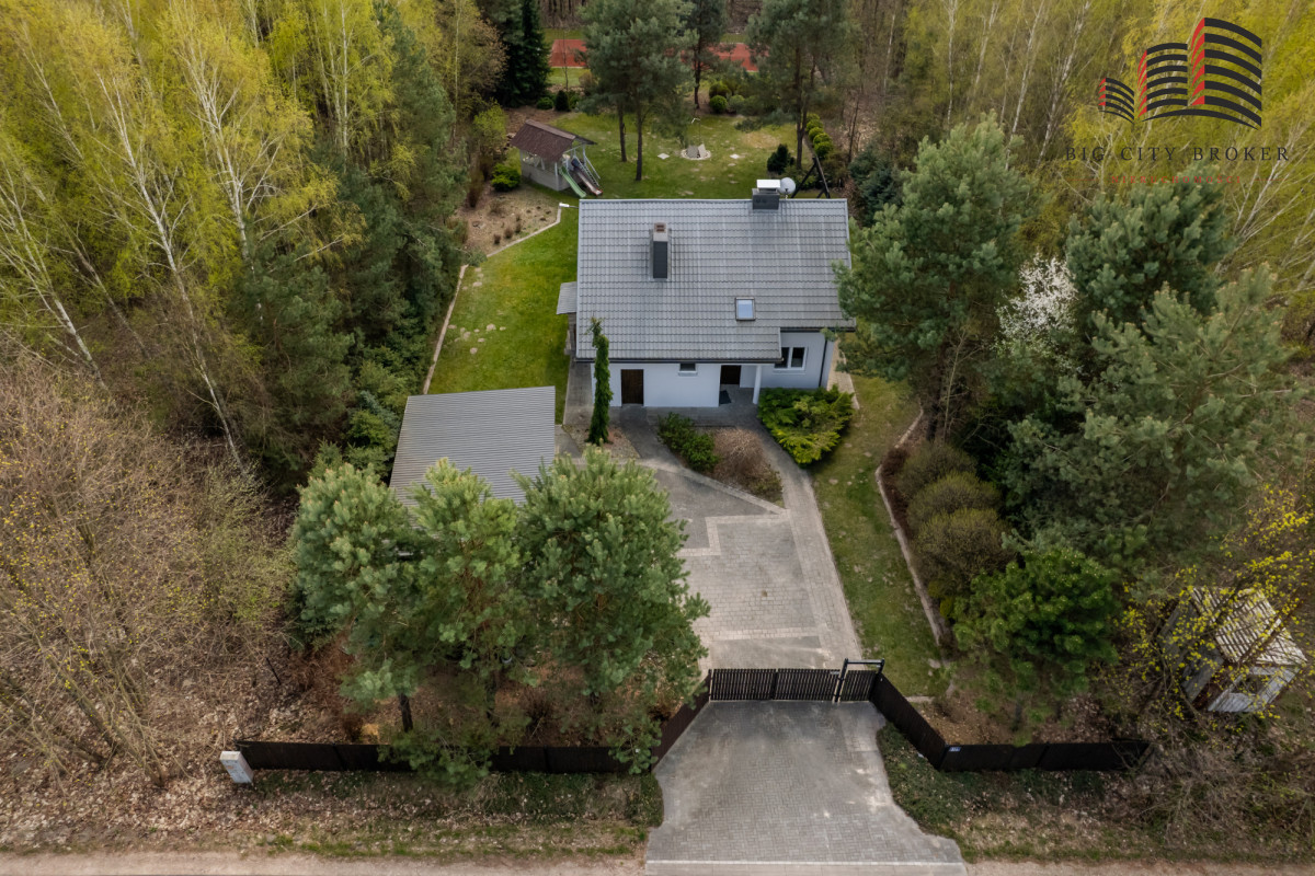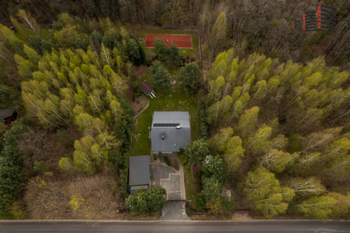 Działka o powierzchni 2003 m² została starannie zagospodarowana — liczne nasadzenia tworzą prywatny, zielony azyl. Na terenie posesji znajduje się również prywatny kort tenisowy, co czyni tę ofertę wyjątkową i atrakcyjną dla osób aktywnych.