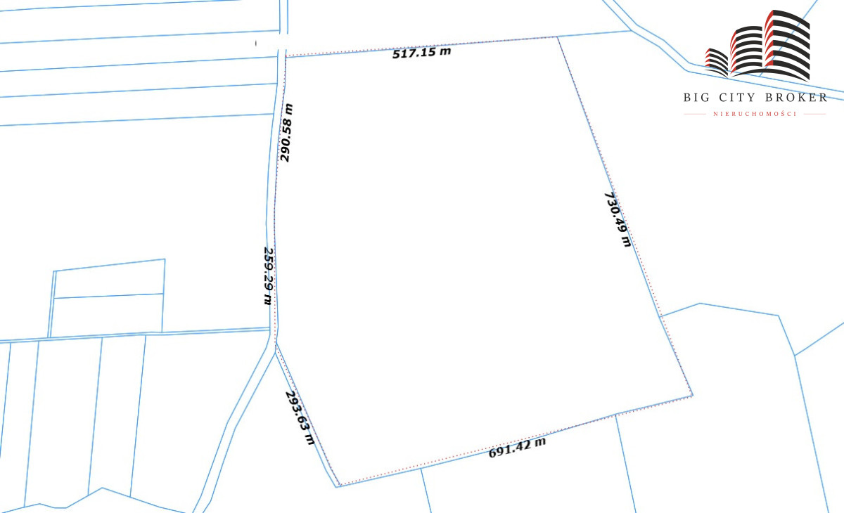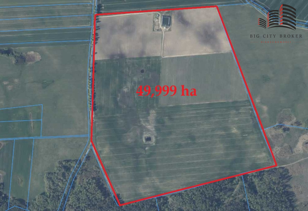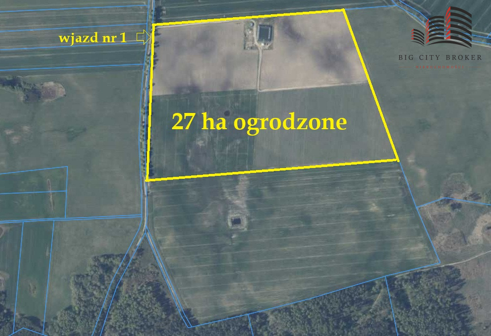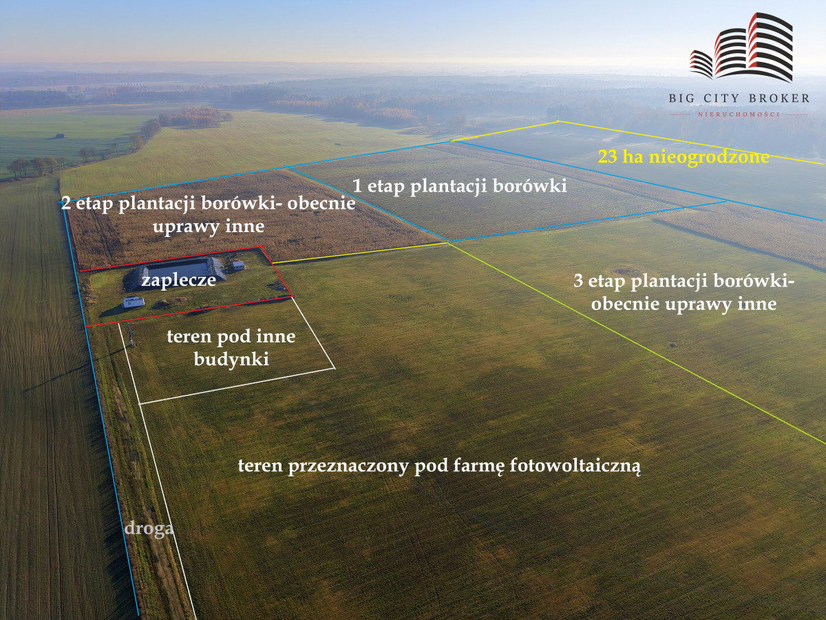 pow. 49,999 ha z czego 27 ha jest ogrodzone. W ogrodzonej części znajduje się plantacja borówki Amerykańskiej, która zajmuje teren 7 ha- reszta terenu jest przygotowana pod uruchomienie kolejnych dwóch etapów plantacji (obecnie teren ten jest obsiewany).