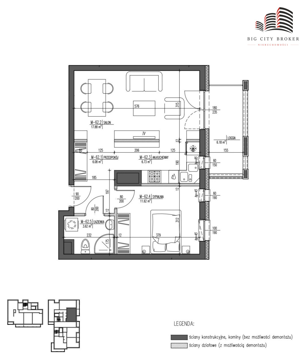 - Salon z aneksem kuchennym - 17.88 m²