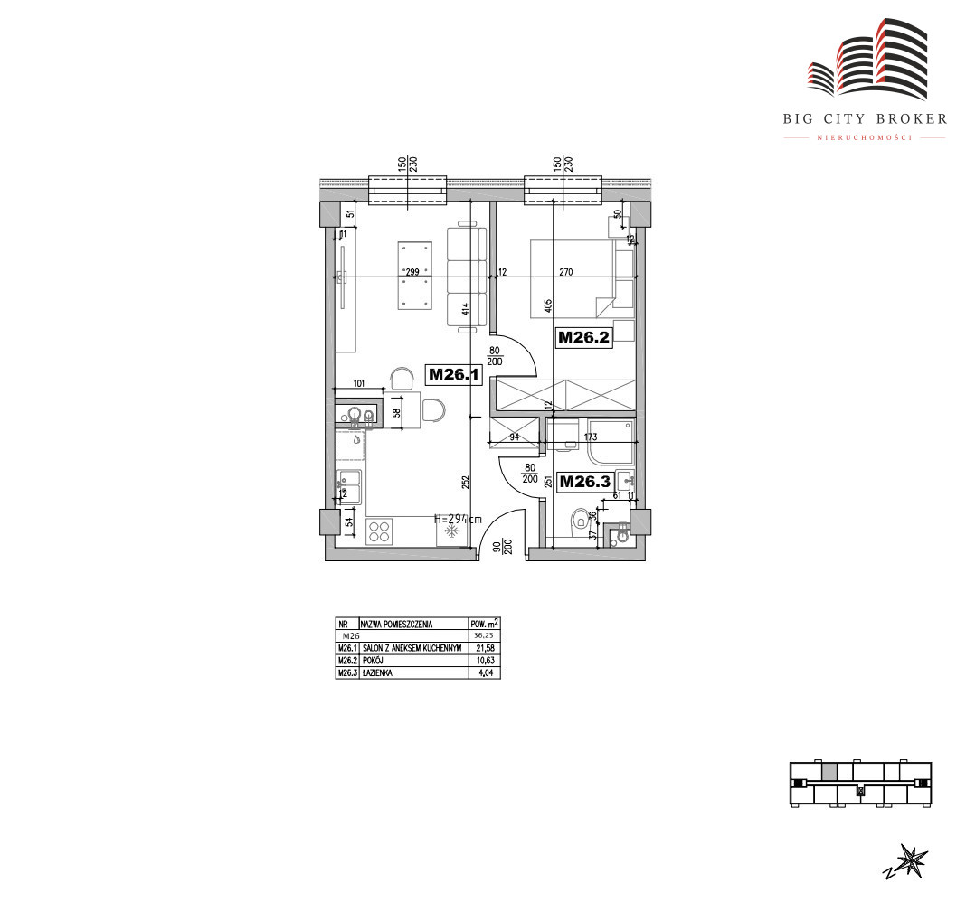 Na powierzchnię 36,25 m² składa się salon z aneksem kuchennym, sypialnia i łazienka.
