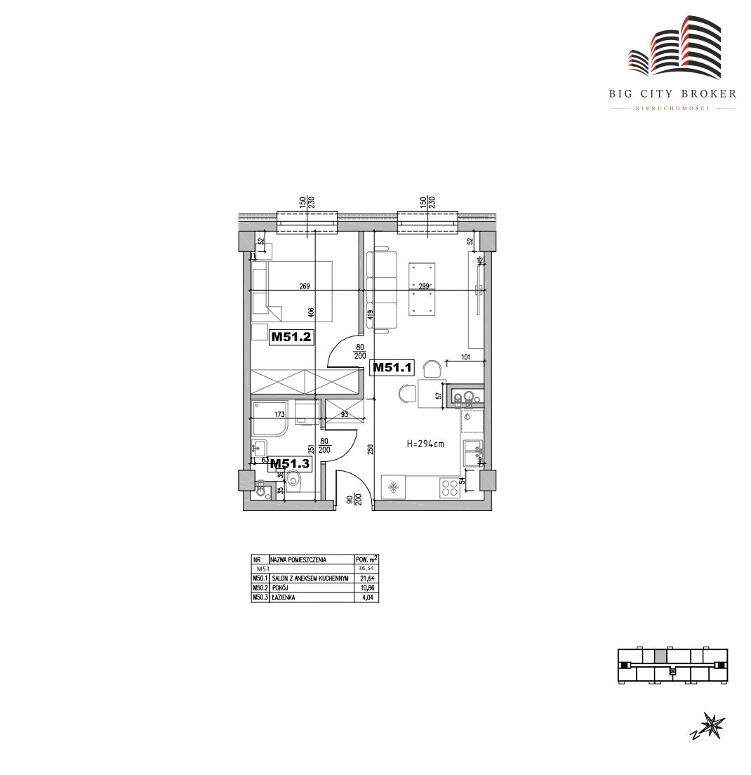 Na powierzchnię 36,54 m² składa się salon z aneksem kuchennym, sypialnia i łazienka.