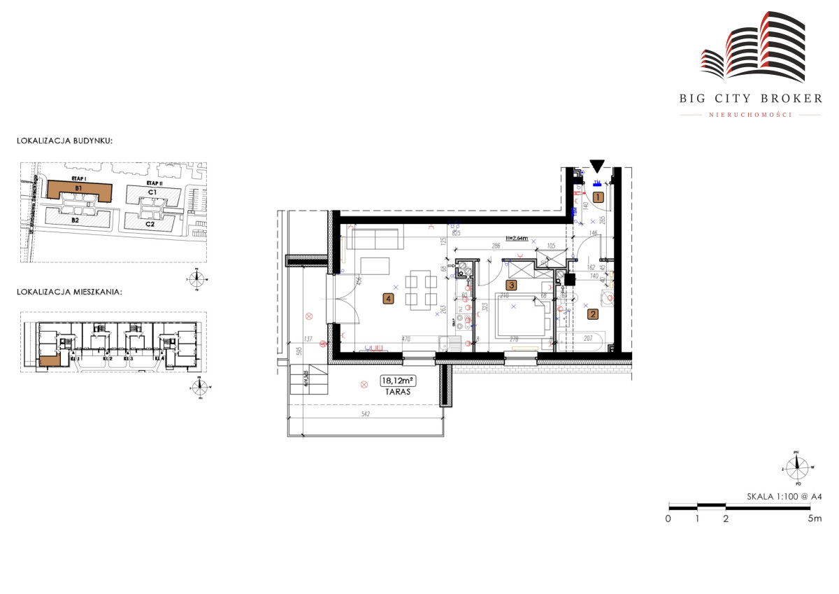 43,57 m², w skład której wchodzi pokój z aneksem kuchennym, sypialnia, łazienka i przedpokój. Do mieszkania przynależy również