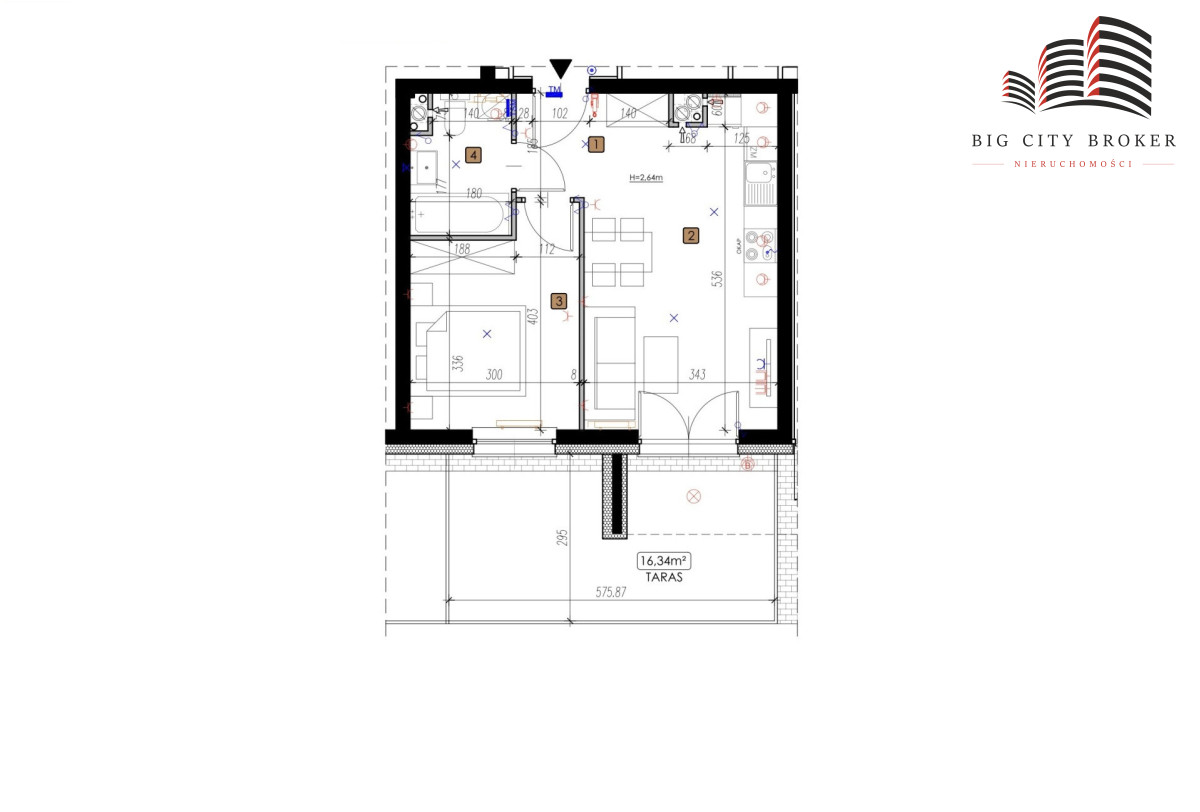 Mieszkanie składa się z salonu z aneksem kuchennym, sypialni oraz łazienki.