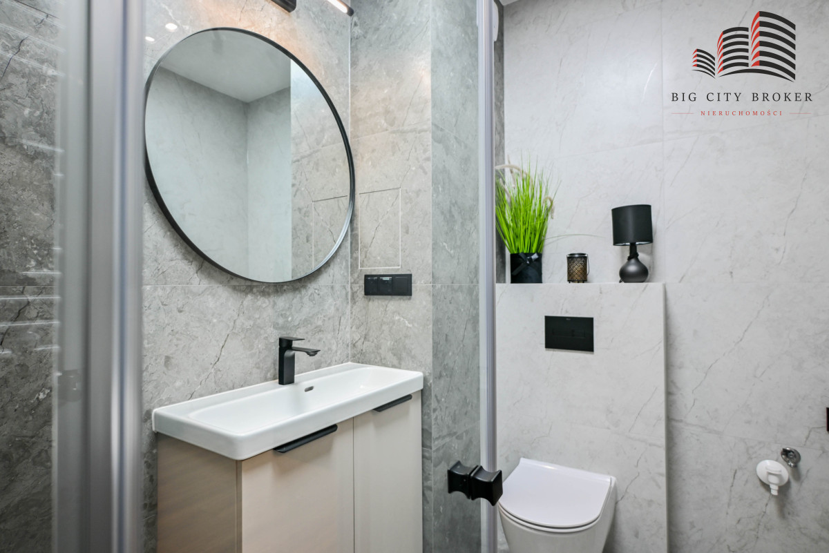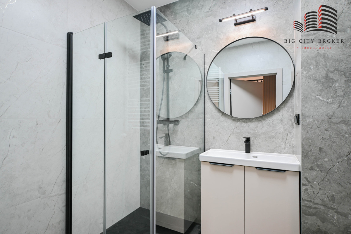 Ustawna łazienka z prysznicem oraz miejscem na pralkę i suszarkę