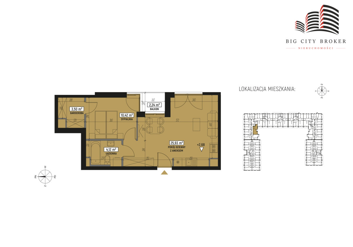 Powierzchnia użytkowa wynosi 43,97 m², w skład której wchodzi pokój z aneksem kuchennym, sypialnia z garderobą, łazienka i przedpokój. Do mieszkania przynależy również balkon o pow. 2,24 m².