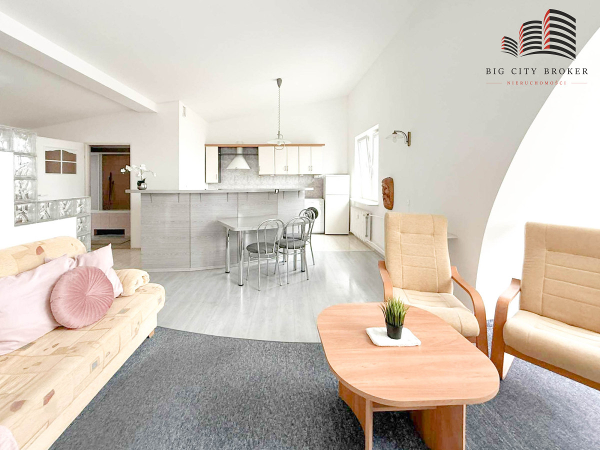 • przestronny salon z aneksem kuchennym (35 m2) i imponującą wysokością w nawyższym punkcie (3,55 m2)