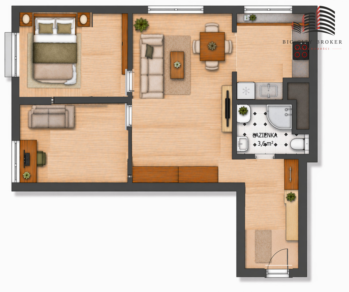 To mieszkanie zostało zaprojektowane tak, aby maksymalnie wykorzystać przestrzeń - oferując 3 niezależne pokoje na niewielkim metrażu, co czyni je wyjątkowo funkcjonalnym zarówno do zamieszkania, jak i pod wynajem:
