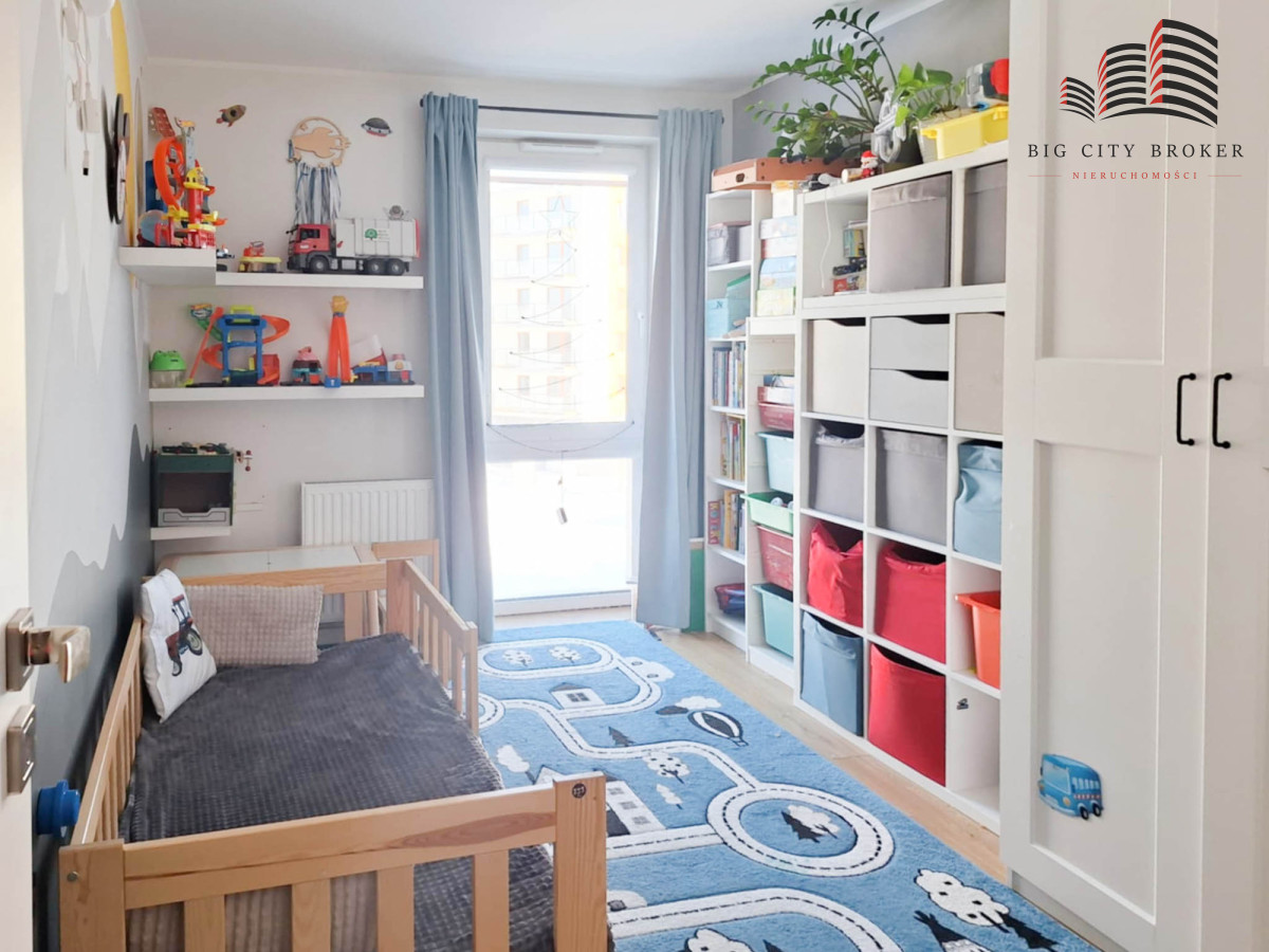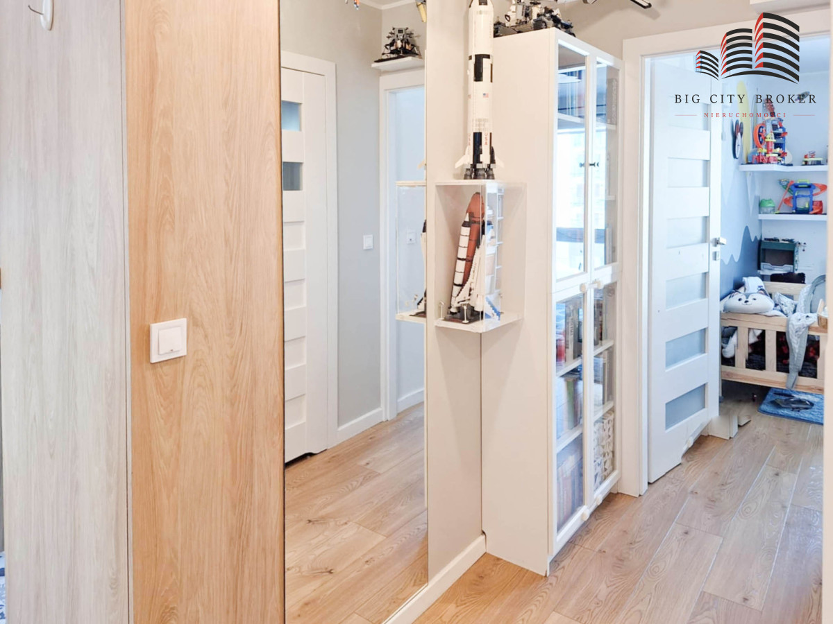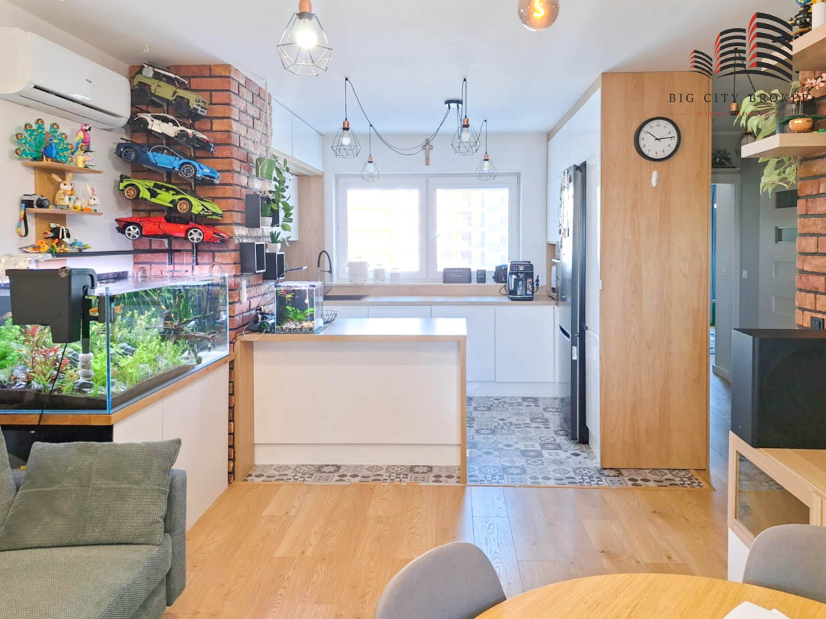 Mieszkanie jest ładnie i spójnie urządzone. Zabudowa kuchenna oraz meble w jednej z sypialni zostały wykonane na wymiar przez stolarza.