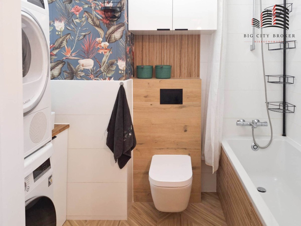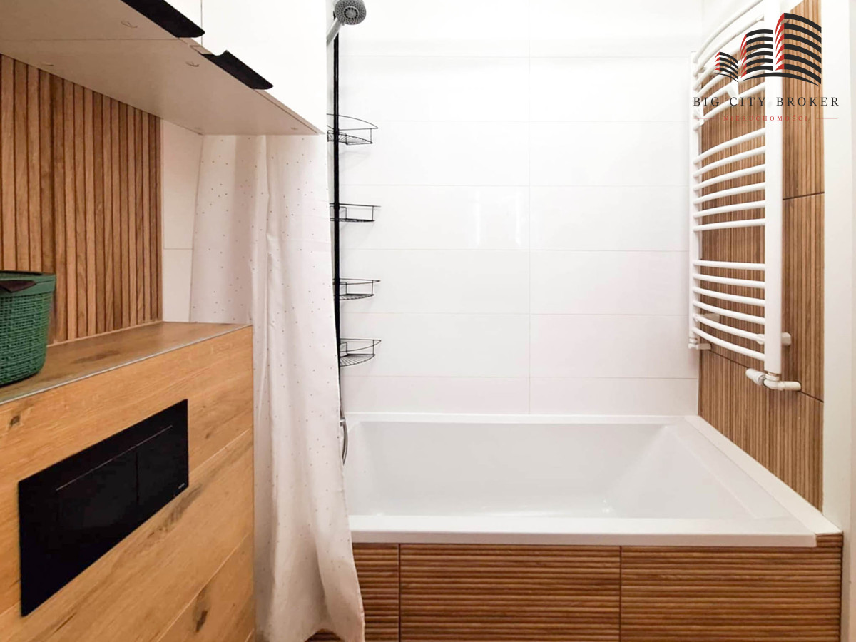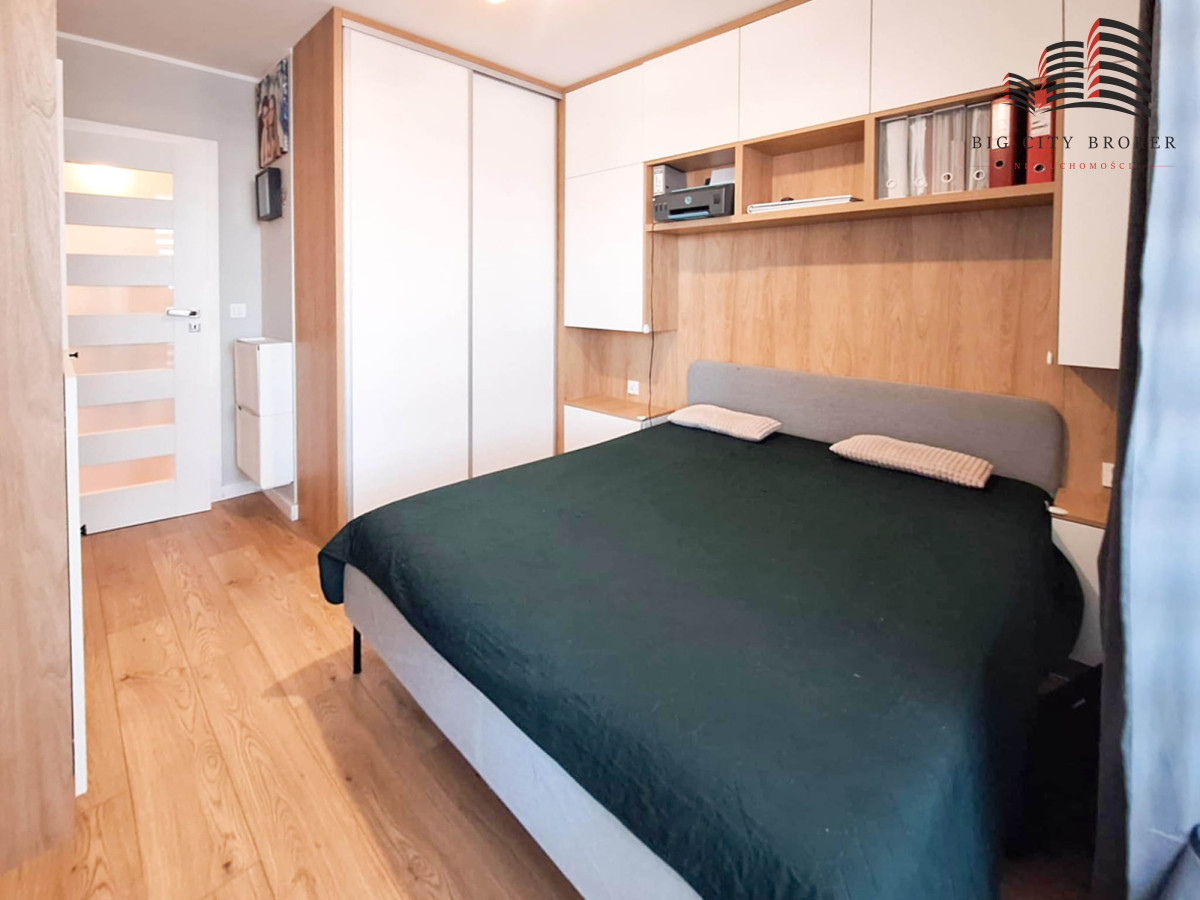 Mieszkanie jest ładnie i spójnie urządzone. Zabudowa kuchenna oraz meble w jednej z sypialni zostały wykonane na wymiar przez stolarza.