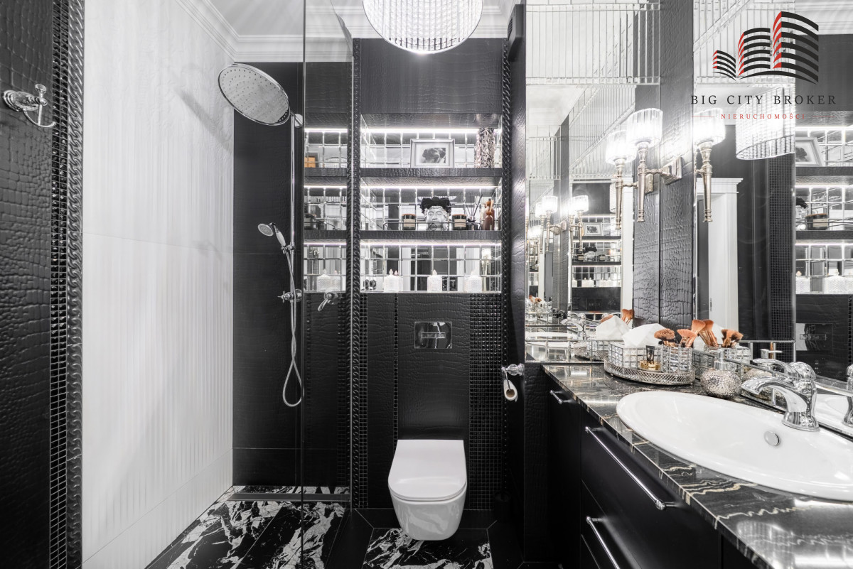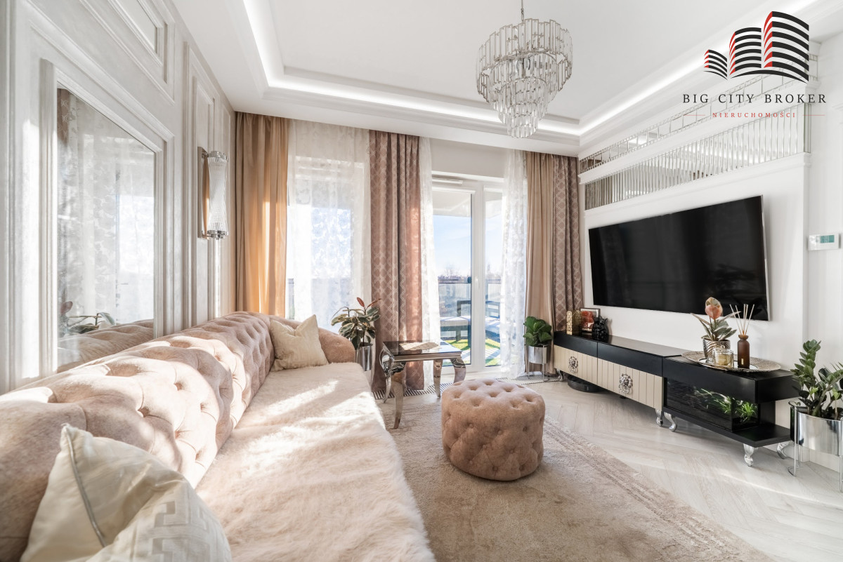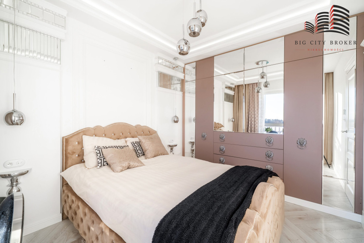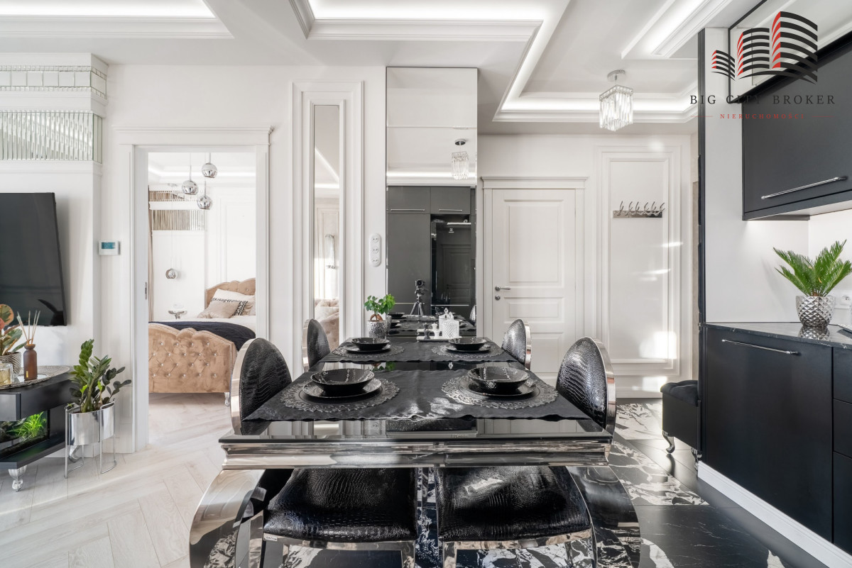 Mieszkanie utrzymane jest w stylistyce glamour: eleganckie lustra, podświetlane sufity oraz stonowana paleta barw tworzą spójną, luksusową całość.