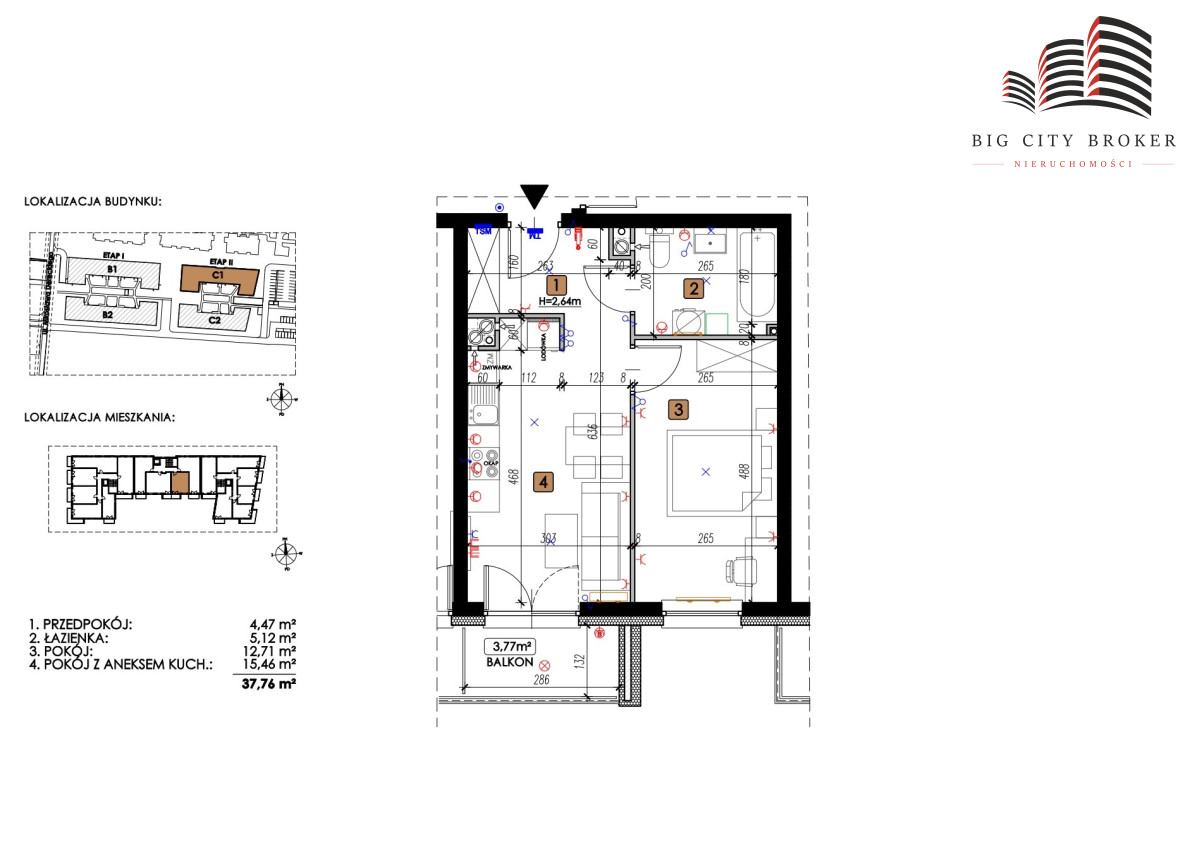 Powierzchnia użytkowa wynosi 37,76 m², w skład której wchodzi pokój z aneksem kuchennym, sypialnia, łazienka i przedpokój. Do mieszkania przynależy również balkon o pow. 3,77 m².